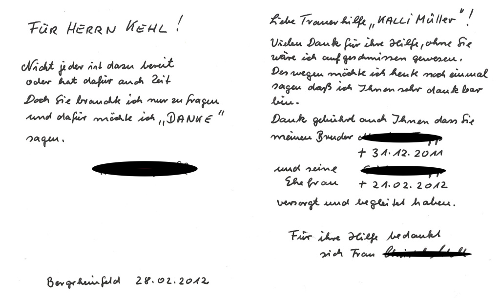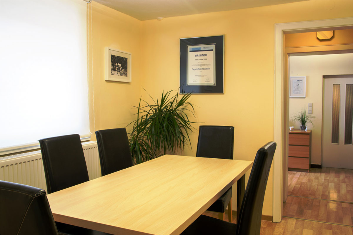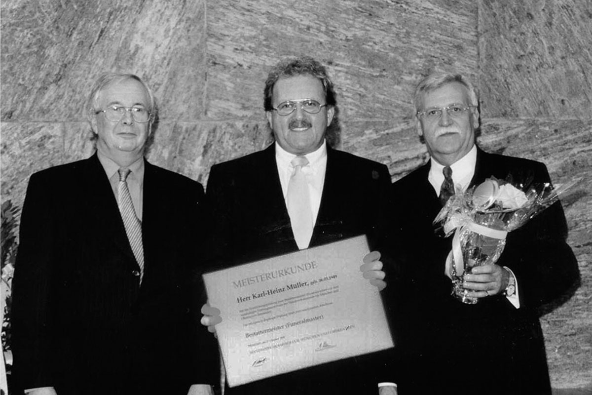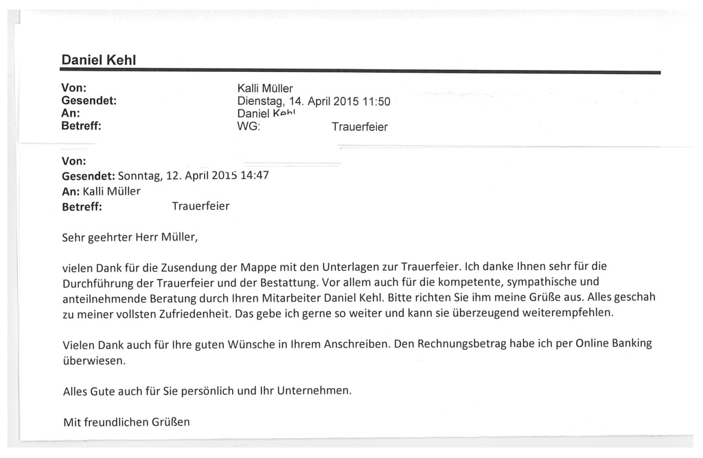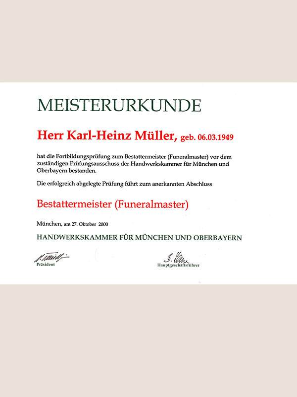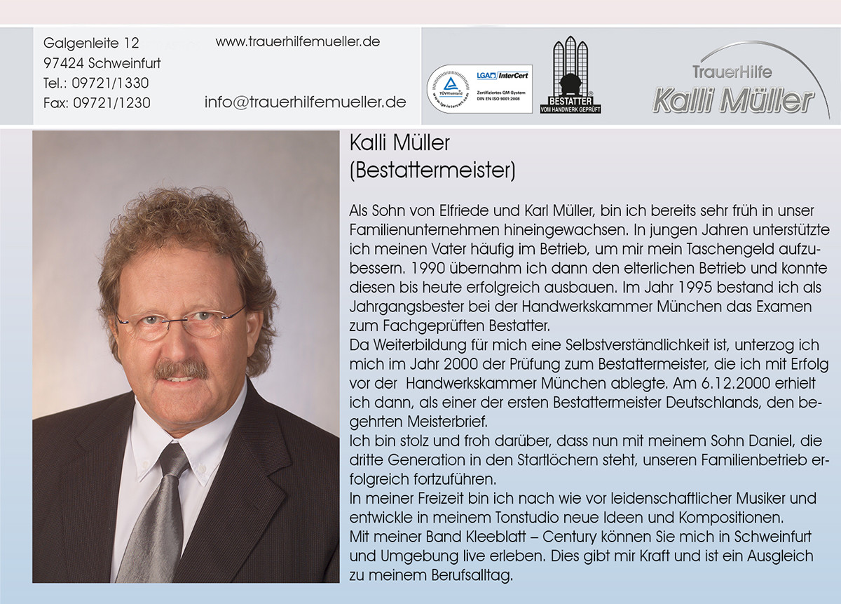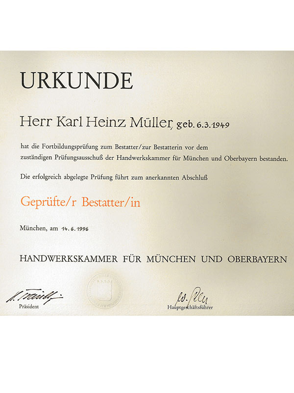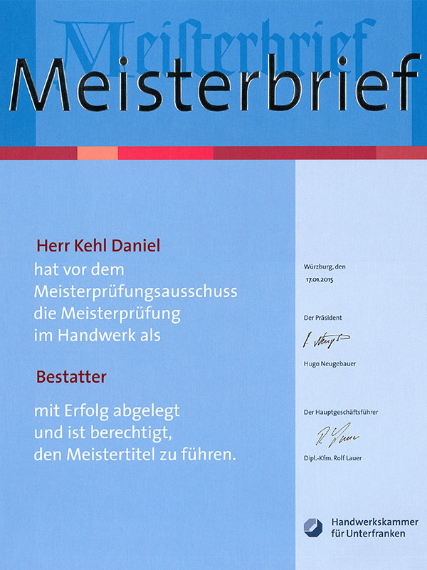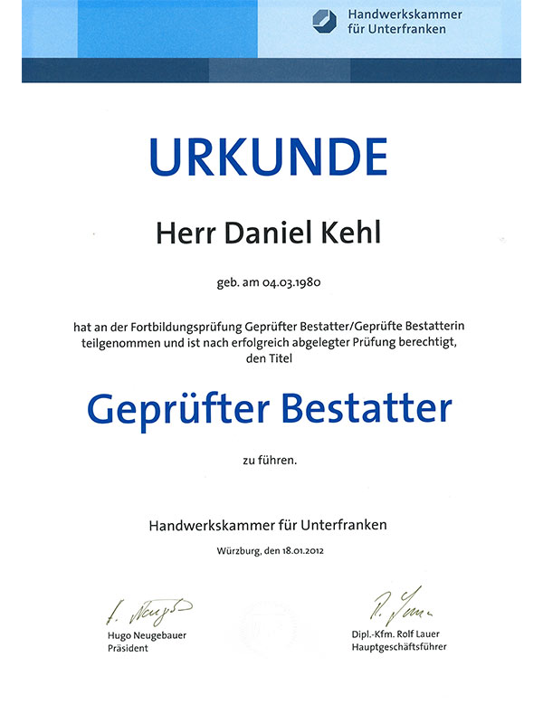 Als Fachgeprüfter Bestatter und Bestattermeister ist Kalli Müller mit all seiner beruflichen Kompetenz für Sie da. Ebenso sein Sohn Daniel Kehl – ursprünglich Betriebswirt im KFZ-Bereich und seit 2008 wichtige Stütze im Betrieb. Im Jahr 2012 legte auch er vor der Handwerkskammer Düsseldorf erfolgreich die Prüfung zum Fachgeprüften Bestatter ab. Zwei Jahre später begannen dann die Lehrgänge zur Meisterprüfung, die im Januar 2015 mit der erfolgreichen Prüfung vor der Handwerkskammer Würzburg und dem Bestattermeister-Titel endeten.