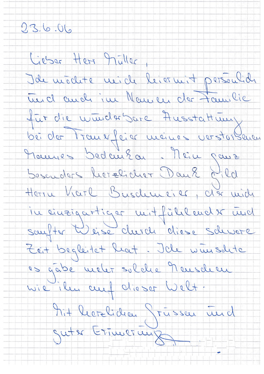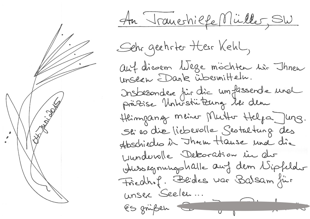 Die TrauerHilfe Kalli Müller ist ein alteingesessenes Unternehmen mit einer langen Familientradition, auf die wir stolz sind – doch unser Blick ist vor allem auch in die Zukunft gerichtet. Und in dieser Zukunft sind wir für Sie da – jederzeit und mit vollem Einsatz.