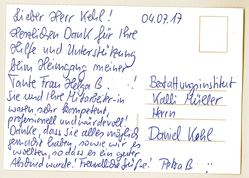Diese Entwicklung führt sein Sohn Kalli Müller mit aller Kraft fort, seit er 1990 die Leitung übernommen hat. Mittlerweile kümmert sich das Team auch um die Floristik, sorgt für die musikalische und dekorative Gestaltung der Trauerfeier, übernimmt die Nachlassverwaltung und vieles mehr.