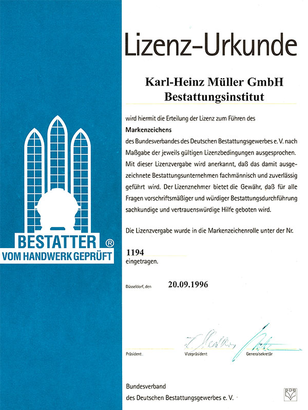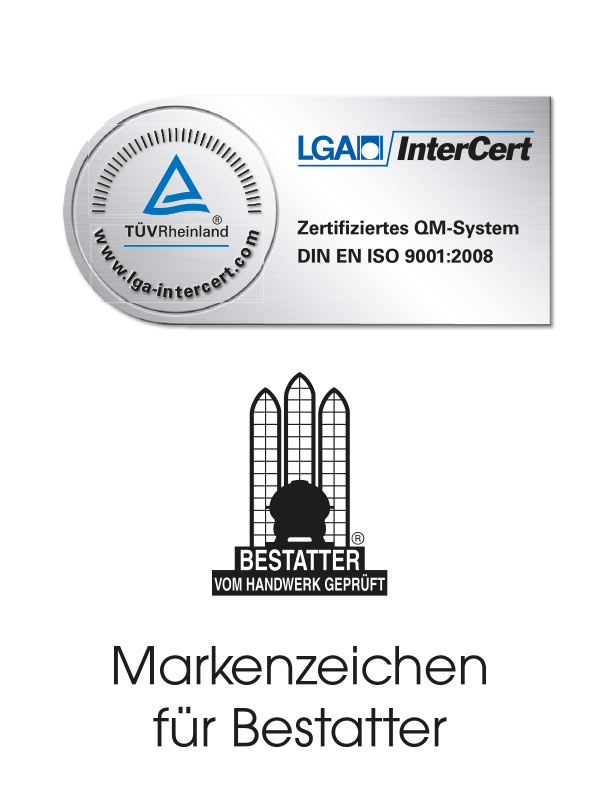 Um Ihnen die Auswahl eines Bestatters zu erleichtern, sind wir Mitglied im Bestatterverband Bayern e. V. und sind berechtigt das Fachzeichen „Bestatter vom Handwerk geprüft“ zu tragen. Deutschlandweit gibt es z. Z. nur ca. 1100 Bestattungsbetriebe die berechtigt sind dieses Fachzeichen zu führen.