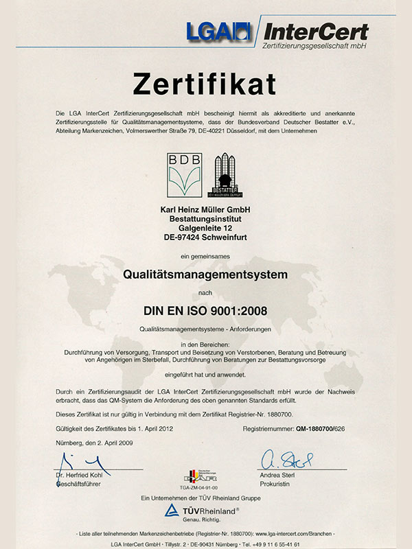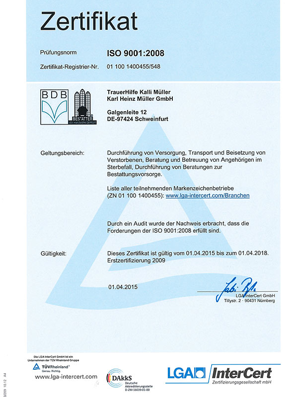 Dieses Fachzeichen garantiert, von unabhängigen Dritten geprüft, eine qualitativ hochwertige Betreuung und Beratung der Angehörigen durch geschulte Mitarbeiter.
